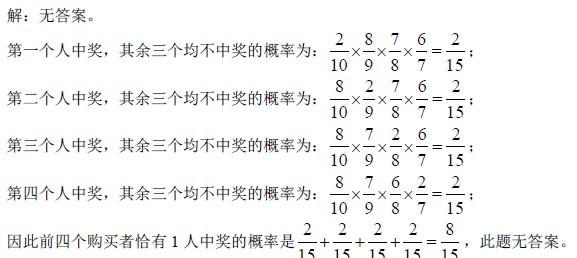 问题 10 张奖券含有2 张中奖的奖券,每人购买1 张,则前四个购买者恰有1 人中奖的概率是: (A)0.84 (B)0.1 (D)0.830.2