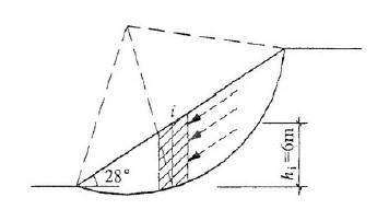 倾角为28°的土坡,由于降雨,土坡中地下水发生平行于坡面方向的渗流,利用圆孤条分法进行稳定分析时,其中第i条高度为6m,作用在该条底面上的孔隙水压力最接近...