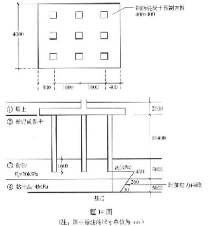 问题 某桩基工程安全等级为二级、其桩型平面布置、剖面及地层分布如图所示,土层及桩基设计参数见图中注,作用于桩端平面处的有效附加应力为400kPa(长期效应组合),其中心点的附加压力曲线如图所示(假定为直线分布)。沉降经验系数φ=1,地基沉降计算深度至基岩面,按《建筑桩基技术规范》(JGJ94一94)验算桩基最终沉降量,其计算结果最接近()。 A.3.6cm B.5.4cm C.7.9cm D.8.6cm