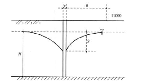 问题 在水平均质具有潜水自由面的含水层中进行单孔抽水试验,如图所示,已知水井半径 r=0.15m,影响半径R=60m,含水层厚度H=10m,水位降深S=3.0m,渗透系数 K=25m/d,流量最接近()。 A.流量为572m3/d B.流量为669m3/d C.流量为737m3/d D.流量为953m3/d