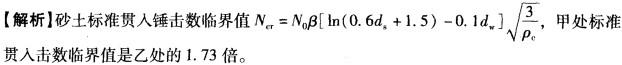 问题 在某两个场地的两个钻孔内的同样深度上进行做标贯试验,用国标《建筑抗震设计规范》(GB 50011 —2010)规定的方法进行砂土液化判别。在其他条件完全相同的情况下,甲场地钻孔标贯处的黏粒含量ρc为1%;乙场地钻孔标贯处的黏粒含量ρc为3%, 则()。 A.甲处的标准贯入击数临界值是乙处的3倍 B.甲处的标准贯入击数临界值是乙处的1.73倍 C.乙处的标准贯入击数临界值是甲处的1.73倍 D.甲、乙两处的标准贯入击数临界值相等