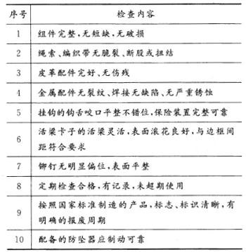 选项 A:组件完整,绳索无捆结 B:组件在使用时间之内 C:绳索需编织,无铆钉加固 D:活梁卡子的活梁表面无滚花 E:配备的防坠器制动可靠