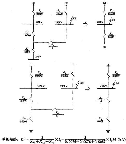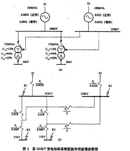 某500kV变电站已知系统阻抗和变压器参数如图4所示,站址位于一块荒地上,围墙外面有水塘。 根据系统阻抗和变压器参数,220kV电压母线单相短路电...