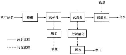 解析 本题涉及的考点为城市污水处理厂的一级污水处理工艺流程。一级处理工艺流程如图所示。主要针对水中悬浮物质,常采用物理的方法,经过一级处理后,污水悬浮物去除可达40%左右,附着于悬浮物的有机物也可去除30%左右。