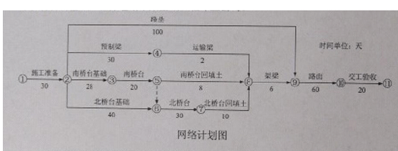 问题 某施工单位承接了某公路项目施工,工程内容含路基、路面及桥梁一座,合同工期220天。根据合同约定,土方工程实际完成最超过清单数量的25%之后,超出部分的土方工程单价由清单报价的20元/立方米下调为18元/立方米。按投标书附录规定,受价格上涨影响,人工、水泥和钢材按调值公式调价。该工程的人工费占全合同价的35%,水泥费用占25%,钢材费用占10%。合同签订后,项目部编制了施工组织设计,安排路基工程与桥梁工程平行施工;路基工程、路面工程分别组织顺序施工,由于施工桥台的钢模板只有一套,南、北桥台亦组织顺序施工。经监理工程师审查批准的网络计划见下图。征得业主同意,施工单位将桥台基础工程分包给了某基础工程专业公司。 基础工程公司在进行北桥台扩大基础施工时,发现地质条件与设计条件不符,出现了较深的软基。通过设计变更,北桥台扩大基础改成了桩基础,由此导致北桥台基础施工时间延长30天,费用增加20万元。对此,基础公司向监理提出工期索赔30天,费用索赔20万元。在路基施工过程中,由于设计变更,路基土方工程量由清单工程量15万立方米增加到21万立方米,工程进行到第4个月时,水泥价格较投标时涨价20%,人工、钢材价格未变,当月承包人完成的工程产值为145万元。路基施工接近尾声时,业主要求承包人仍需按原合同工期完成施工。承包人拟采取将路面基层与路面面层间的顺序施工调整为分两个施工段组织无节拍流水施工的措施(路面基层在两个施工段上的持续时间均为20天,路面面层在两个施工段上的持续时间均为10天),以期在合同工期内完成施工。【问题】1.指出图中“南桥台”与“北桥台”之间的逻辑关系是工艺关系还是组织关系。计算“北桥台”最早开始施工时间。指出关键线路。2.计算路基土方工程的结算价。(保留两位小数)3.计算第4个月调价后的结算款。(保留两位小数)4.计算分析路面基层与面层施工组织方法调整的可行性。
