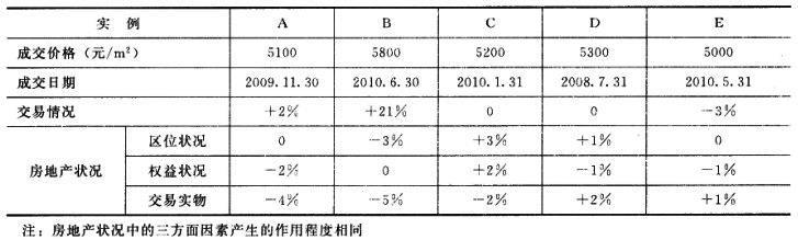 问题 共用题干 从2008年7月1日至2009年1月1日该类住宅楼市场价格每月递增1.5%,其后至2009年11月1日则每月递减0.5%,而从2009年11月1日至2010年4月30日的市场价格基本不变,以后每月递增1%。估价人员拟从以下几个交易实例中选取三个作为可比实例,并估算该住宅楼2010年8月31日的正常单价。(如需计算平均值,请采用简单算术平均)。