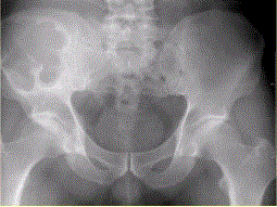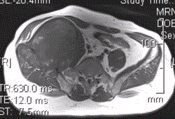 患者男,28岁,右下腹及臀部疼痛5个月余。查体:右髂骨外后侧压痛,右下腹可触及一软组织包块,质韧,固定。行骨盆正位CR、骨盆CT及MR扫描见下图。...