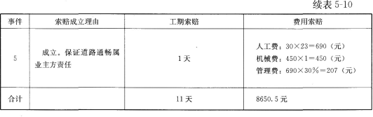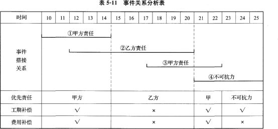 解析 问题1: 问题2: 上部结构施工过程出现的事件1至事件4属同一施工过程某时间段多方责任共同发生事件的索赔类型,应采用初始责任原则进行分析,分析过程见表5-11。 事件1:费用补偿按窝工处理,补偿费用=(60×100+400× 5)×0.4=3200(元),合同工期顺延5天。 事件2:不补偿,属乙方责任。 事件3:费用正常补偿,补偿费用=(150×60+400×10)×2/5=5200(元),合同工期顺延 2天。 事件4:不可抗力事件,只进行工期补偿,工期顺延3天。 共计补偿费用8400元,合同工期顺延10天。