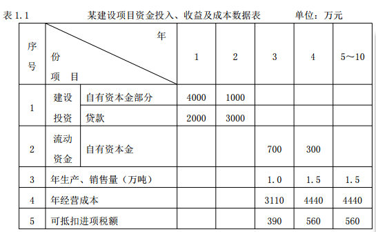 问题 【背景资料】某拟建项目财务评价数据如下: 1.建设期 2 年,生产运营期 8 年。第 3 年投产,第 4 年开始达到设计生产能力。 2.建设投资 10000 元(包含可抵扣固定资产进项税额 800 万元),其中 1000 万元为无形资产;其余形成固定资产。 3.固定资产按直线法折旧,折旧年限 12 年,残值率为 5%。 4.无形资产在运营期内,均匀摊入成本。 5.项目的设计生产能力为年产量 1.5 万吨某产品,预计每吨不含税销售价为 5000 元,增值税销项税率为不含税销售收入的 17%,增值税附加为应纳增值税额的 12%计取,所得税税率为 25%。 6.项目各年的资金投入、收益、成本等基础数据,见表 1.1。 7.还款方式:建设投资贷款在项目运营期前 5 年等额本息偿还,贷款年利率为 6%。 问题: 1.列式计算固定资产折旧费、无形资产摊销费。 2.列式计算运营期各年应纳增值税、增值税附加。 3.列式计算运营期第 1 年应偿还的本金、利息。 4.列式计算运营期第 1 年的总成本费用、利润总额、净利润。 (计算结果保留两位小数)