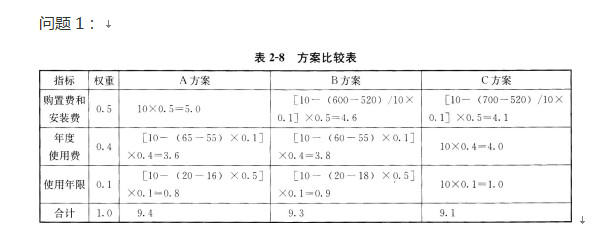 问题 某智能大厦的一套设备系统有A、B、C三个采购方案,其有关数据,见表2-6。现值系数见表27。 问题: 1.拟采用加权评分法选择采购方案,对购置费和安装费、年度使用费、使用年限三个指标进行打分评价,打分规则为:购置费和安装费最低的方案得10分,每增加10万元扣0.1分;年度使用费最低的方案得10分,每增加1万元扣0.1分;使用年限最长的方案得10分,每减少1年扣0.5分;以上三个指标的权重依次为0.5、0.4和0.1。应选择哪种采购方案较合理 2.若各方案年费用仅考虑年度使用费、购置费和安装费,且已知A方案和C方案相应的年费用分别为123.75万元和126.30万元,列式计算B方案的年费用,并按照年费用法作出采购方案比选。 3.若各方案年费用需进一步考虑大修费和残值,且已知A方案和C方案相应的年费用分别为130.41万元和132.03万元,列式计算B方案的年费用,并按照年费用法作出采购方案比选。 4.若C方案每年设备的劣化值均为6万元,不考虑大修费,该设备系统的静态经济寿命为多少年 (问题4计算结果取整数.其余计算结果保留2位小数)