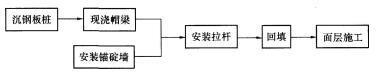 解析 1.本工程主体施工的流程如下: 2.钢板桩沉桩采用的沉桩工艺主要包括: (1)设置导向梁(架); (2)采用一次沉桩或多次往复沉桩方法; a.一次沉桩:每1~2根桩一次达到设计标高; b.往复沉桩:以若干桩为一批,先插立在导梁(架)内,沉桩时先沉两端头1~2根桩,后沉中间其余桩。 3.沉桩过程中可能出现的异常情况及采取的措施: (1)沿板桩墙轴线方向垂直度超标:采用楔形桩方法纠偏; (2)板桩偏移轴线产生平面扭转:在后续沉桩中逐根纠正; (3)沉板桩时将邻近已沉桩“带下”或“上浮”,对“带下”板桩,后沉桩桩顶标高适当提高;对“上浮”板桩复打至设计标高; (4)脱榫或不连锁现象,应与设计单位研究处理。 4.安装拉杆应重点控制: (1)拉杆应搁置在垫平的垫块上; (2)拉杆连接铰的转动轴线应位于水平面上; (3)在帽梁混凝土强度达到设计强度且锚碇墙前回填完成后方可张拉; (4)张紧拉杆时应使拉杆具有设计要求的初始应力; (5)拉杆安装完成后,对防护层进行检查,对涂层缺漏、损坏处进行修补。