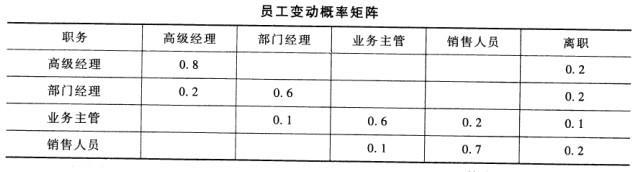 问题 共用题干 某企业的高级经理、部门经理、业务主管和销售人员四类岗位年初员工数量分别为10人、20人、40人和80人。年内这四类岗位员工的变动概率如下:
