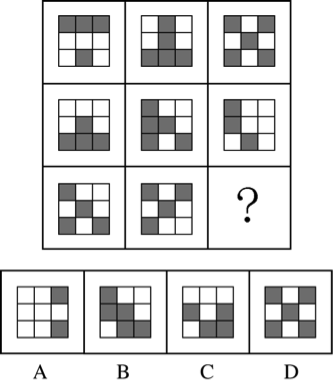 从所给的四个选项中,选择最合适的一个填入问号处,使之呈现一定的规律性:A. 见上图B. 见上图C. 见上图D. 见上图