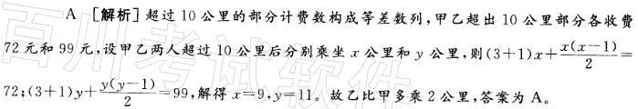 问题 某城市出租费实行分段计费,10公里内3元,超出10公里部分每公里在3元基础上以1元每公里的幅度递增,不足公里时以整公里计算。甲乙两人分别付费75元和102元,则乙比甲多乘()公里。 A. 2 B. 4 C. 6 D. 8