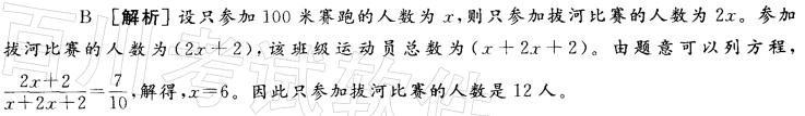 问题 某班级在学校举行的春季运动会中组织同学报名参加拔河和100米赛跑两项比赛。只有2人同时参加了这两项运动。已知该班级参加拔河比赛的运动员与该班级运动员总人数之比为7:10,且只参加拔河比赛的人数是只参加100米赛跑的人数的2倍。则只参加拔河比赛的运动员有( )人。 A.10 B.12 C.14 D.16