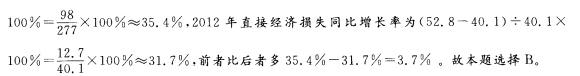 问题 2012年,全国共发生各类地质灾害14322起,其中滑坡10888起、泥石流922起、地面塌陷347起、地裂缝55处、地面沉降22起。造成292人死亡、83人失踪、259人受伤,造成直接经济损失52.8亿元。与上年相比,发生数量下降8.6%。全年特大型地质灾害防治专项资金投入35亿元,成功预报地质灾害3532起,避免人员伤亡39964人,避免直接经济损失8.1亿元。 2012年死亡失踪人数同比增长率比2012年直接经济损失同比增长率多( )个百分点。 A. 2.8 B. 3.7 C. 4.7 D. 5.3