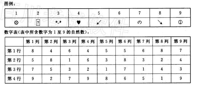 根据图例和数字表回答下列各题:数字表中第9列四个数字之积各位数字对应的符号是( )。