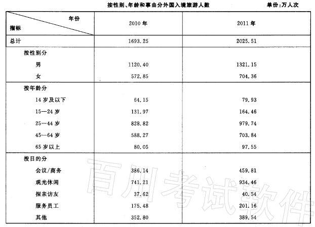 解析 A项,从表中可知,2011年65岁以上外国入境旅游者人数为97. 55万人,总人数为2025.51万人,所占比例远小于50%,所以A项正确。因为可以确定A项正确,B、C、D项不需要再看。故本题选择A项。