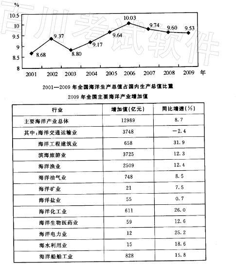 解析 本题属于文字分析题。 B项,直接从表格读数,2009年增加值排名第三的产业为海洋渔业,但增速排名第三的为海洋电力业,B项说法错误; C项,直接从折线图读数,2008年海洋生产总值占国内生产总值的比重为9. 60,而2005午的比重为9. 64,2008年的比重低于2005年的比重,C项说法错误; D项,增加值的比较。从表格可知,2009只有海洋运输业增加值的同比増速为负值,2009年的增加值小于2008年的增加值,因此2009年增加值同比下降。D选项正确,故本题应选D。