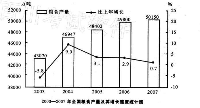 解析 2007年秋粮产量占全年粮食产量的比例为35420/50150 X 100%≈70. 63%,2006 年的秋粮和全年粮食产量变化的比例相差较小,对图形的形状影响不大,因此可知C选项符合題意。