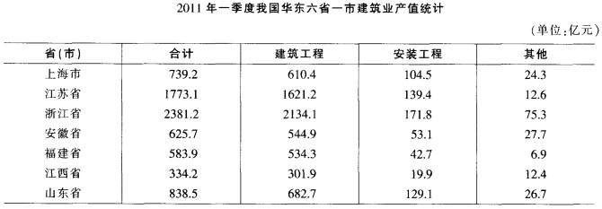 问题 2011年一季度我国建筑业产值为16096.4亿元。其中,建筑工程产值14220.0亿元,安装工程产值1405.2亿元,其他471.2亿元。华东六省一市相关数据见下表。 2011年一季度,江苏省建筑业产值占我国建筑业产值的比重是()。 A.8.76% B.10.01% C.17.25% D.ll.02%