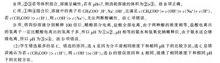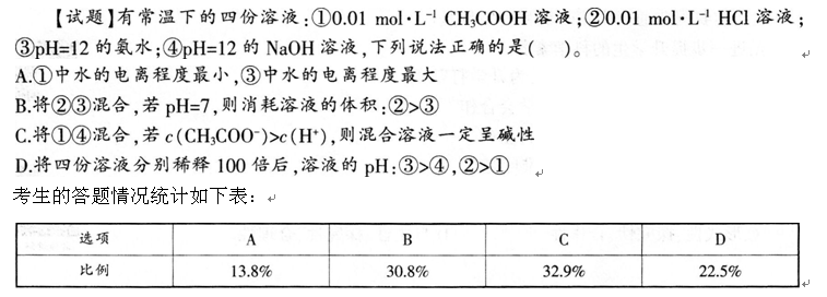 问题 某化学教师在一次化学测验中设计了下列试题.并对学生的解题结果进行了统计和分析。 试根据上述信息.回答问题: (1)本题正确的选项是什么?(4分)请分别对各选项进行解析。(6分) (2)学生错选最多的选项是哪个?试分析学生错选的原因。(5分)