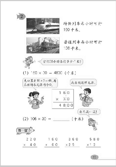 解析 1、模型思想 数学模型是用数学语言概括地或近似地描述现实世界事物的特征,数量关系和空间形式的一种数学结构。数学的模型思想是一般化的思想方法,数学模型的主要模型形式是数学符号表达式和图表,因而它与符号化思想有很多相同之处,同样具有普遍的意义。 本课属于乘积模型。小学数学中的数量关系有两个基本的模型:一个是总体等于部分的和,即求和的模式,部分+部分=和;另一个模型是乘积的模型,总价=单价×数量、路程=速度×时间,这两个常见的数量关系是乘积关系的模型。 2、 教学目标 知识与技能:让学生经历探索三位数乘以两位数笔算方法的过程,掌握三位数乘以两位数的基本笔算方法,能正确进行计算。 过程与方法:让学生在探索计算方法和解决实际问题的过程中体会新旧知识的联系,能主动总结、归纳三位数乘以两位数的笔算方法,培养类比及分析,概括能力,发展应用意识。 情感态度价值现:让学生在主动参与活动的过程中,进一步体验数学在日常生活中的运用,感受估算在生活中的应用。 3、教学环节 (一)复习导入 1.观察下列算式中两个因数有什么特点?(板书:因数末尾有0) 出示:60×50 240×20 师:你是怎么口算的?(学生讨论) 师:(板书口算方法)你能用口算的方法进行笔算吗? 2.这节课继续学习笔算乘法(板书课题:笔算乘法) 【设计意图】复习口算知识,为末尾有0的乘法笔算做好准备;复习笔算知识,为中间有0的笔算除法做好准备,同时熟悉乘法笔算的基本步骤。 (二)巧用知识迁移,自主构建新知 师:你能运用因数末尾有0的笔算乘法解决生活中的问题吗? 出示材料,特快列车每小时可行160千米,普通列车每小时可行106千米。 师:读材料,你能提出什么问题?(学生讨论) 1.出示问题:特快列车每小时行160千米,30小时能行多少千米? 分析数量关系,学生自主列算式。 师:观察这道题,算式的因数有什么特点?(板书因数末尾有0)你想怎么算? 提示学生①3为什么和6对齐?②积末尾的2个0是怎么得来的?③如果末位对齐,个位上的0乘160得几?这一步可以省略不写吗? 2.因数中间有0,计算时应该注意什么?怎样算更加简便。 两个因数末位有0的简便算法是"先把0前面的数相乘,再看两个因数末位一共有几个0,则在积的末尾添写上几个0。" (板书:末尾有0不漏算。) 3.出示问题例题 普通列车每小时行106千米,30小时能行多少千米? 分析数量关系,学生自主列算式。 师:观察这道题算式的因数有什么特点?(因数中间有0)应该注意什么? 因数中间有0的乘法,用0乘这一步可以省略,但要注意用因数哪一位上的数乘,乘得的数的末位就要和那一位对齐。 【设计意图】使学生通过对比选择,掌握竖式的简便写法,在自主探索中掌握中间、末尾有0的计算方法。在这个过程中,要注意引导学生在自主探索、合作交流中体验各种算法,选择出最优的方法。 (三)巩固练习 师:下面,老师带同学们到数学王国遨游吧! 1.完成课后练习 2.独立完成,全班讨论 【设计意图】通过多层次的练习,让学生对练习过程中既强化了本节课的学习重点,又训练了学生的思维,打破思维定势,培养学生思维的灵活性。 (四)师生小结,畅谈收获 【设计意图】小结本课重点,加深印象,感受学习知识的过程。