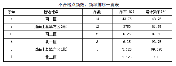 问题 1.背景 某机场飞行区场道土石方工程施工由甲乙两个施工单位承担。甲施工单位承担南区施工,乙施工单位承担北区施工。南北两区均有道面土基区和土面区填方施工。 技术标准:道面土基填方区,压实度不小于98%;土面填方区,压实度不小于90%,施工过程中对道面土基、土面区压实度进行了检验,检验结果见下表: 2.问题 (1)统计各部位压实度不合格检验点数量,并按顺序列出不合格点数的频数、频率(%)、累计频率(%)排列表。 (2)使用排列图法(巴雷特图法)画出各不合格点排列图,分析并确定哪个部位的施工是主要问题。 (3)分析并比较甲乙施工单位的施工质量水平。