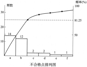解析 (1)依据已知条件,检验统计结果见下表: 计算各部位不合格点的频数、频率并排顺序,结果见下表: (2)绘制排列图,见下图: 累计频率0~80%的问题为主要问题(A类问题),由图可知,南一区和土基填方区(南)填方施工是主要问题。 (3)南区检验点总数44个,合格点数16个,合格率36.4%;北区检验点总数22个,合格点数18个,合格率81.8%;乙施工单位施工质量高于甲施工单位的施工质量。