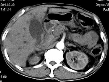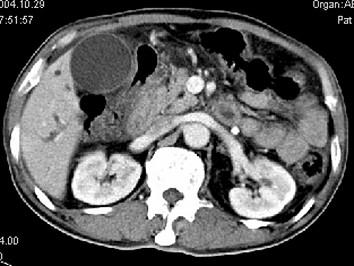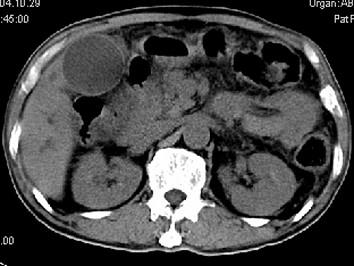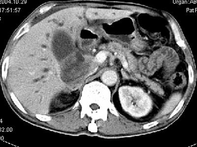 男,58岁,患者右季肋区疼痛,皮肤黄染,可触及肿大胆囊,B超提示胆囊颈部肿块影,CT所见如图,最可能的诊断是 ( )A、慢性胆囊炎B、...