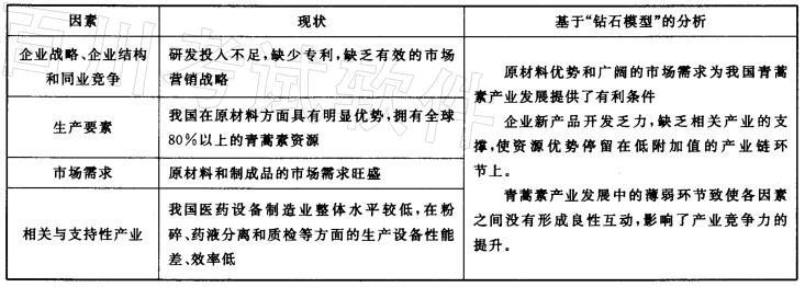 问题 【材料一】优势产业的培育,既与图中四种因素的基本状况密切相关,又与这些因素能否相互促进有关。这一分析框架用图形表示如同钻石的顶面,因此被形象地称为“钻石模型”。 【材料二】青蒿素是我国自主研发的治疗疟疾的药品,因其速效、高效而得到世界卫生组织的高度评价,但是,受多种因素的影响,近年来我国青蒿素产业的发展遇到一些难题。 结合材料一和材料二,依据唯物辩证法的基本观点和要求,针对我国青蒿素产业的现状,说明如何提髙该产业的竞争力。