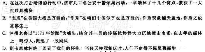 解析 A项,“倾巢出动”,贬义,用在这里形容公安干警打击赌博,感情色彩不对。B项,形容对传闻之事议论纷纷,现多指某种言论十分嚣张。C项,“一鸣惊人”比喻平时没有特殊的表现,一做起来就有惊人的成就。这与“一贯的传媒优势”相矛盾。D项,“弹冠相庆”指官场中一人当了官或升了官,同伙就互相庆贺将有官可做。多用贬义。