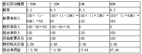解析 (1)甲采取的是保护性看跌期权投资策略。   (2)投资组合预期收益计算如下: 组合预期收益=(-2.56)×0.2+(-2.56)×0.3+17.44×0.3+47.44×0.2=13.44(元)