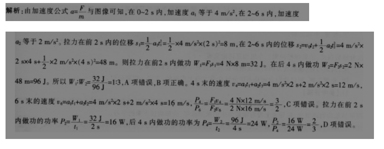 选项 A.拉力在前2 S内和后4 s内做的功之比为1:1 B.拉力在前2 s内和后4 s内做的功之比为1:3 C.拉力在4 s末和6 S末做的功的功率之比为2:3 D.拉力在前2 s内和后4 S内做的功的功率之比为1:1