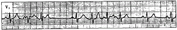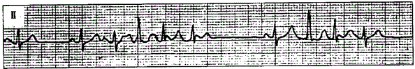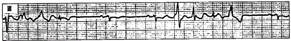 解析 :该心电图符合短阵多源性房性心动过速的特点:P′波位于QRS波群之前,P′波形态多样,提示心房激动来源于不同的部位;RP′间期与P′R间期不固定,部分P′波下传受阻,因而RR间距也不规则;个别QRS波群变形,为心房率过快时室内差异性传导所致。