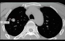 男性,25岁,低热、咳嗽2月。胸部CT见图,最可能的诊断是 ( )A、肺脓肿B、支气管扩张C、肺结核球D、肺癌E、急性血行播散型肺结核