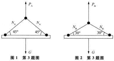 吊同一重物,斜索夹角不同,如图1、图2所示,设斜索中拉力为N,总吊索拉力为P,则()。A、PA>PB