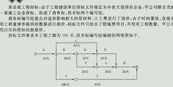 解析 1.建设单位对投标单位的限定不合法。 公开招标应该平等地对待所有的投标人,不允许对不同的投标人提出不同的要求。《中华人民共和国招标投标法》规定,招标人不得以不合理的条件限制或者排斥潜在投标人,不得对潜在投标人实行歧视待遇。 2.商务标编制存在的不妥当之处及改正措施如下述。 (1)不妥当之处:只对原材料、人工费进行了询价。 改正:还应对机械设备的租赁价、分部分项工程的分包价等进行询价。 (2)不妥当之处:按照招标文件给定的分部分项工程量清单进行投标报价。 改正:应该根据招标文件中提供的相关说明和图纸,重新校对工程量,重新确定报价。 (3)不妥当之处:措施费按照以往的投标经验进行报价。 改正:应该根据企业自身特点和工程实际情况,结合施工组织设计对招标人所列的措施项目做适当增减。 3.技术标编写组绘出的网络计划图工期为175d。 关键线路为A、B、D、E、H。 工期满足招标文件要求。 4.最终的技术标还应补充得内容:①编制施工组织设计;②选择施工方案和工艺,确定技术、质量、安全文明施工和环境保护等方面措施;③应依据企业所提供的资源,确定现场临时设施及环境保护、文明安全施工、材料二次搬运等方案;④应依据工程进度,编制各种资源需求计划;⑤制定交通导行方案和现场平面布置图。