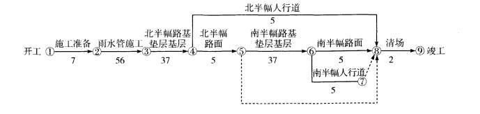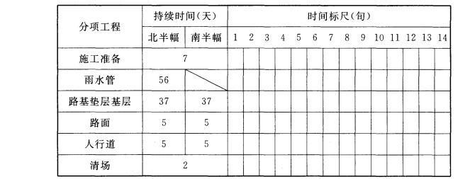 问题 【案例五】 某沿海城市道路改建工程4标段,道路正东西走向,全长973. 5m,车行道宽度15m,两边人行道各3m,与道路中心线平行且向北,需新建DNS00mm的雨水管道973m。新建路面结 构为150mm厚砾石砂垫层,350mm厚二灰混合料基层,80mm厚中粒式沥青混凝土,40mm 厚SMA改性沥青混凝土面层。合同规定的开工日期为5月5日,竣工日期为当年9月30日。合同要求施工期间维持半幅交通,工程施工时正值高温台风季节。 某公司中标该工程以后,编制了施工组织设计,按规定获得批准后,开始施工。施工组织设计中绘制了以下的总网络计划图。 图中,雨水管施工时间已包含连接管和雨水口的施工时间;路基、垫层、基层施工时间中已包含旧路翻挖、砌筑路缘石的施工时间。 施工组织设计中对二灰混合料基层雨季施工作了如下规定:混合料含水量根据气候适当调整,使运到施工现场的混合料含水量接近最佳含水量;关注天气预报,以预防为主。 为保证SMA改性沥青面层施工质量,施工组织设计中规定摊铺温度不低于160C,初压开始温度不低于150C,碾压终了的表面温度不低于90C;采用振动压路机,由低处向高处碾压,不得用轮胎压路机碾压。 【问题】 1.指出本工程总网络计划图中的关键线路。 2.将本工程总网络计划改成横道图,横道图模板如下,请将模板复制到专用答题卡上作答。 3.根据总网络图,指出可采用流水施工压缩工期的分项工程。 4.补全本工程基层雨季施工的措施。 5.补全本工程SMA改性沥青面层碾压施工要求。