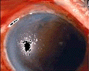问题 患者,男性,60岁,远视眼,左眼因闭角型青光眼行小梁切除术,术后第1天诉眼胀痛。检查左眼前房消失,眼压40mmHg。 (如图)最有可能的诊断是 ( )