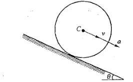 问题 半径为R、质量为m的均质圆轮沿斜面做纯滾动如图所示。已知轮心C的速度为v、加速度为a,则该轮的动能为: