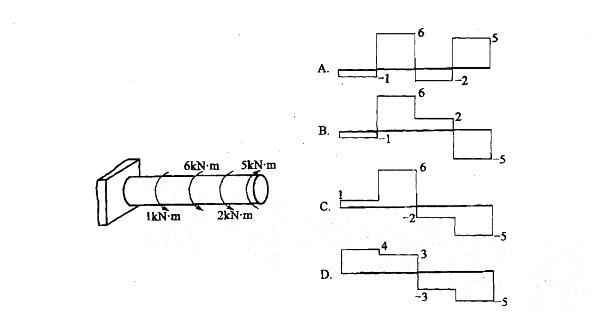 解析 提示:首先考虑整体平衡,设左端反力偶m在外表面由外向里转,则有MX = 0,即m-1-6-2+5=0,所以m=4kN?m。 再由直接法求出各段扭矩,从左至右各段扭矩分别为4kN?m、3kN?m、-3kN?m、-5kN?m在各集中力偶两侧截面上扭矩的变化量就等于集中偶矩的大小。显然符合这些规 律的扭矩图只有D图。