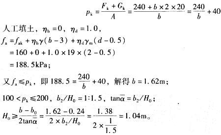 问题 某仓库外墙采用条形砖基础,墙厚240mm,基础埋深2.0m,已知作用于基础顶面标高处的上部结构荷载标准组合值为240kN/m。地基为人工压实填上,承载力特征值为160kPa,重度19kN/m3。按照现行《建筑地基基础设计规范》,基础最小高度最接近下列哪个选项的数值?( ) A. 0.5m B. 0.6m C. 0.7m D. 1. 1m
