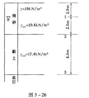 问题 计算图3-26所示土层的自重应力及作用在基岩顶面的土自重应力和静水压力之和最接近( )kPa。 A. 96 B. 165 C. 170 D. 180