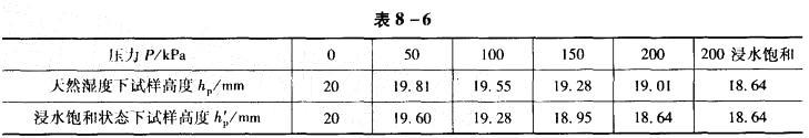 某黄土试样进行室内双线法压缩试验,一个试样在天然湿度下压缩至200kPak力稳定后浸水饱和,另一试样在浸水饱和状态下加荷至200kPa,试验成果数据如表8...