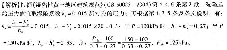 问题 某黄土试样进行室内双线法压缩试验,一个试样在天然湿度下压缩至200kPak力稳定后浸水饱和,另一试样在浸水饱和状态下加荷至200kPa,试验成果数据如表8-6所示,按此数据求得的黄土湿陷起始压力Psh最接近( )kPa。 A. 75 B. 100 C. 125 D. 175
