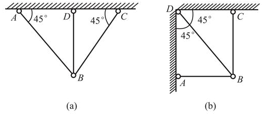 图示两桁架温度均匀降低t℃,则温度引起的结构内力为(  )。 A. (a)无,(b)有 B. (a)有,(b)无 C. 两者均有 D. ...