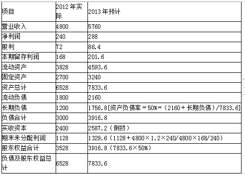 解析 (1)预计2013年主要财务数据 单位:万元 2013年所需的外部筹资额及其构成:   长期负债筹资额=1756.8-1200=556.8(万元)   实收资本筹资额=2587.2-2400=187.2(万元)   外部筹资额=556.8+187.2=744(万元)   (2)可持续增长率   =权益净利率×利润留存率/(1-权益净利率×利润留存率)   权益净利率=240/3528×100%=6.8%,   股利支付率=72/240×100%=30%   可持续增长率=6.8%×(1-30%)/[1-6.8%×(1-30%)]×100%=5%   外部融资额   =6528×5%-1800×5%-168×(1+5%)=60(万元)   因为不增发新股,流动负债均为经营负债,所以外部融资全部是长期负债。   (3)经营资产销售百分比-经营负债销售百分比-[(1+增长率)÷增长率]×预计营业净利率×(1-预计股利支付率)=0   经营资产销售百分比=6528/4800×100%=136%   经营负债销售百分比=1800/4800×100%=37.5%   营业净利率=240/4800×100%=5%   股利支付率=72/240×100%=30%   (136%-37.5%)-[(1+g)/g]×5%×(1-30%)=0   解得:g=3.68%,即内含增长率=3.68%