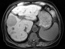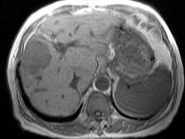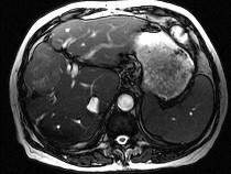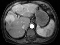 问题 男40岁肝区疼痛,消瘦乏力,腹部包块,AFP阳性,MR检查如图,最佳的诊断是哪一项()