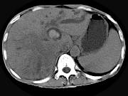 男,44岁,右上腹痛半年,腹部未触及包块,轻度黄疸,AFP阴性,CT检查如图,最可能的诊断为()A.原发性肝癌B.胆管细胞癌C.肝...